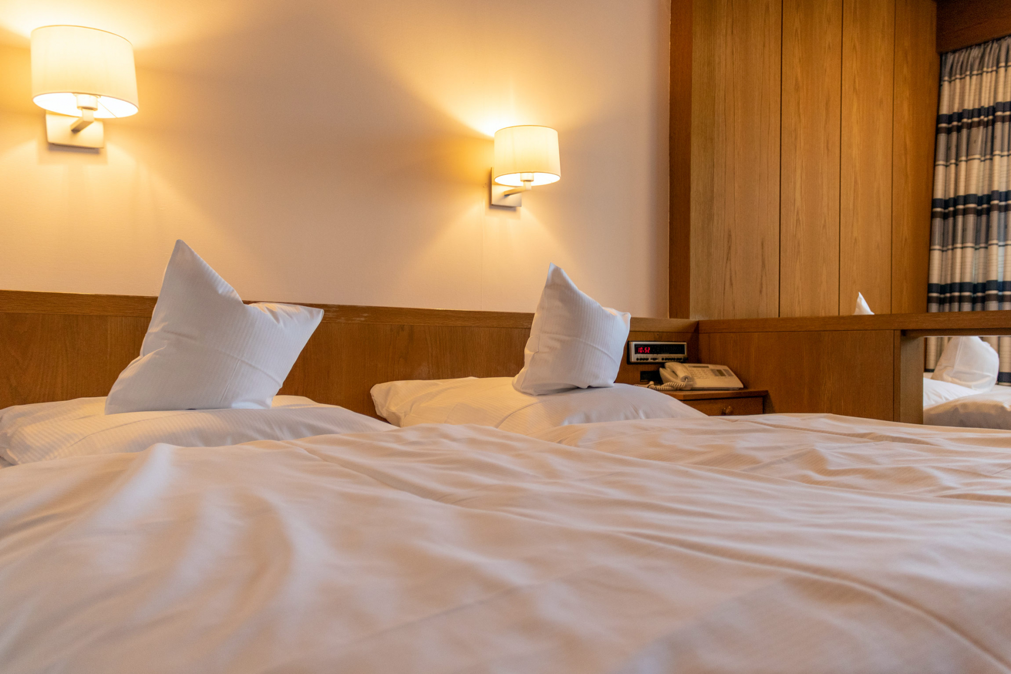 mit Doppelbetten (2 x 90 cm breit, 200 cm lang) und 1 – 3 Zustellbetten (mind. 80 cm breit und 180 cm lang); Flachbild-TV, Radio und Zimmersafe, teilweise mit Balkon, teilweise kein Teppichboden, keine Klimaanlage, keine Minibar.